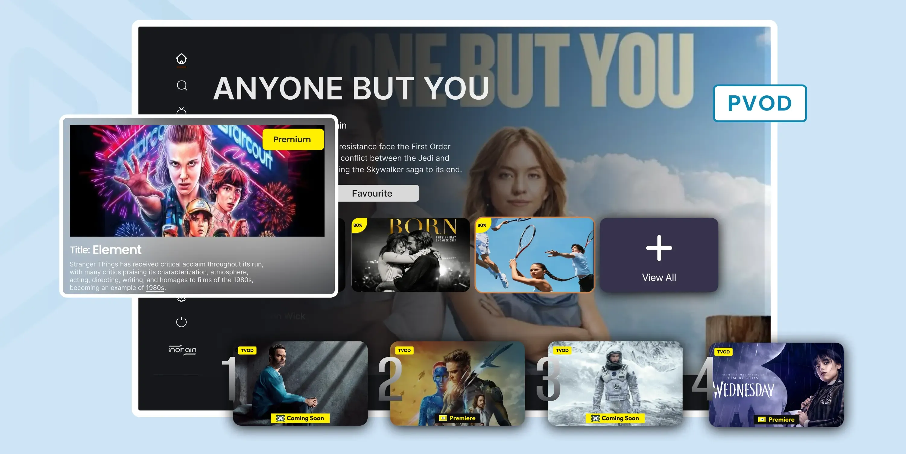 PVOD is a form of TVOD that charges a higher one-time fee for early access to high-profile content, often at the same time or shortly after theatrical releases. It’s intended for users willing to pay more to watch premium content at home before it’s widely available.