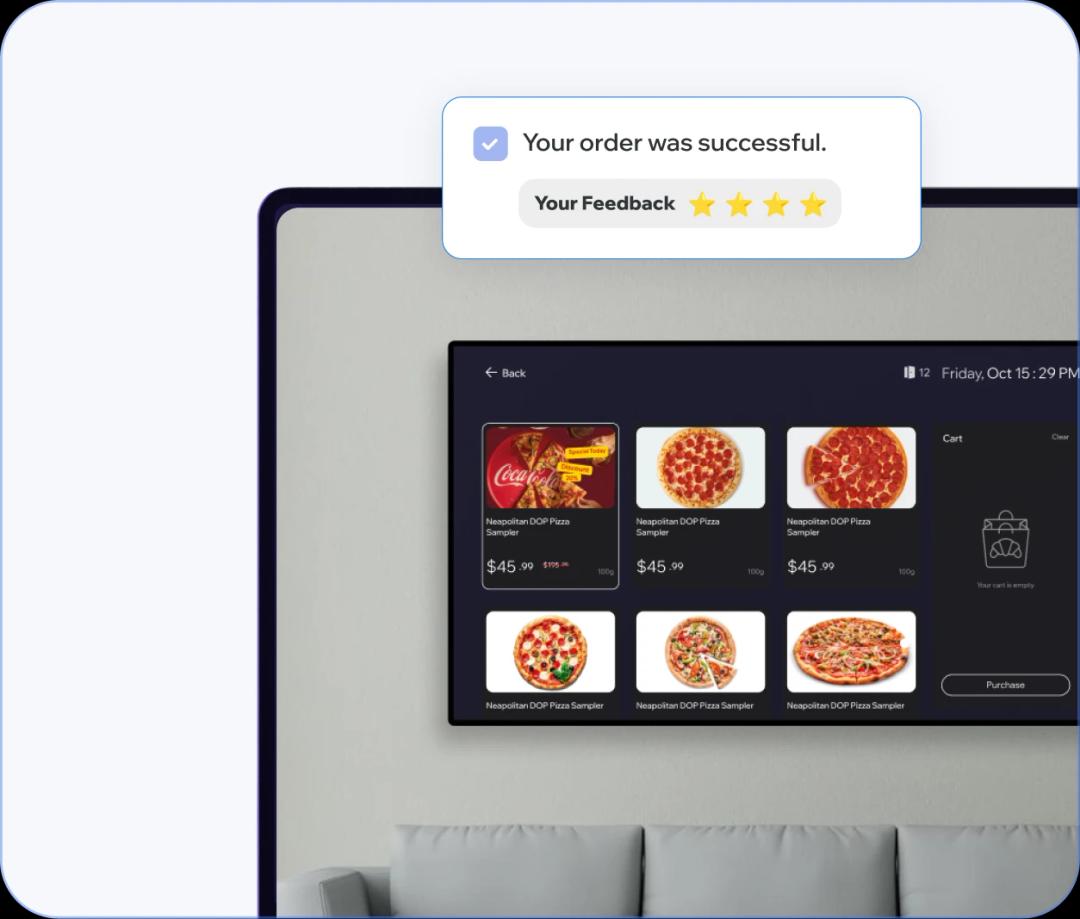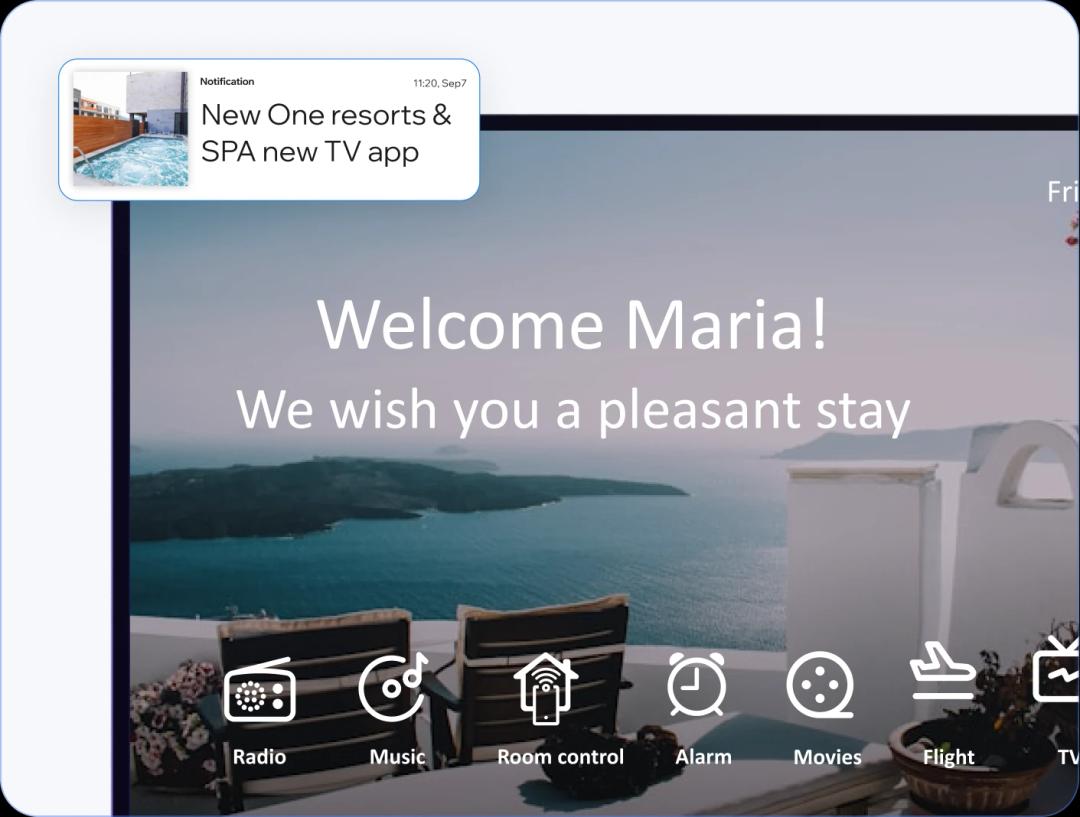 A personalized welcome screen greets your guest in the room, while digital signage in the lobby highlights offers, events, and hotel services.